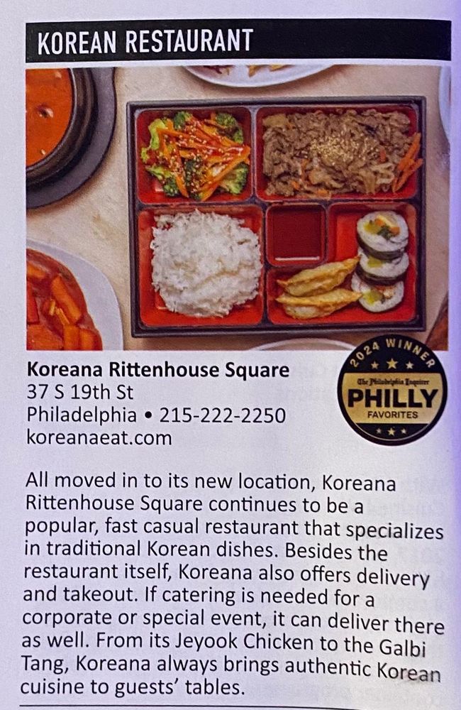 Koreana is a popular Asian-owned restaurant located in the heart of Rittenhouse Square, Philadelphia. Offering a wide range of dishes and drinks, Koreana is known for its delicious cuisine and excellent service. Customers rave about the fresh Watermelon Mojito and Cucumber Mojito, highlighting the use of fresh ingredients. The bento boxes are a favorite, offering a variety of sides like japchae and mandu. The lunch specials, including the sweet and sour tofu, are highly recommended. The friendly staff and cozy atmosphere make Koreana a great spot for a quick lunch or a relaxed dinner. Whether dining in or taking out, Koreana's menu is sure to satisfy your cravings for authentic Korean cuisine. With options for delivery, catering, and reservations, Koreana is a versatile choice for all occasions.